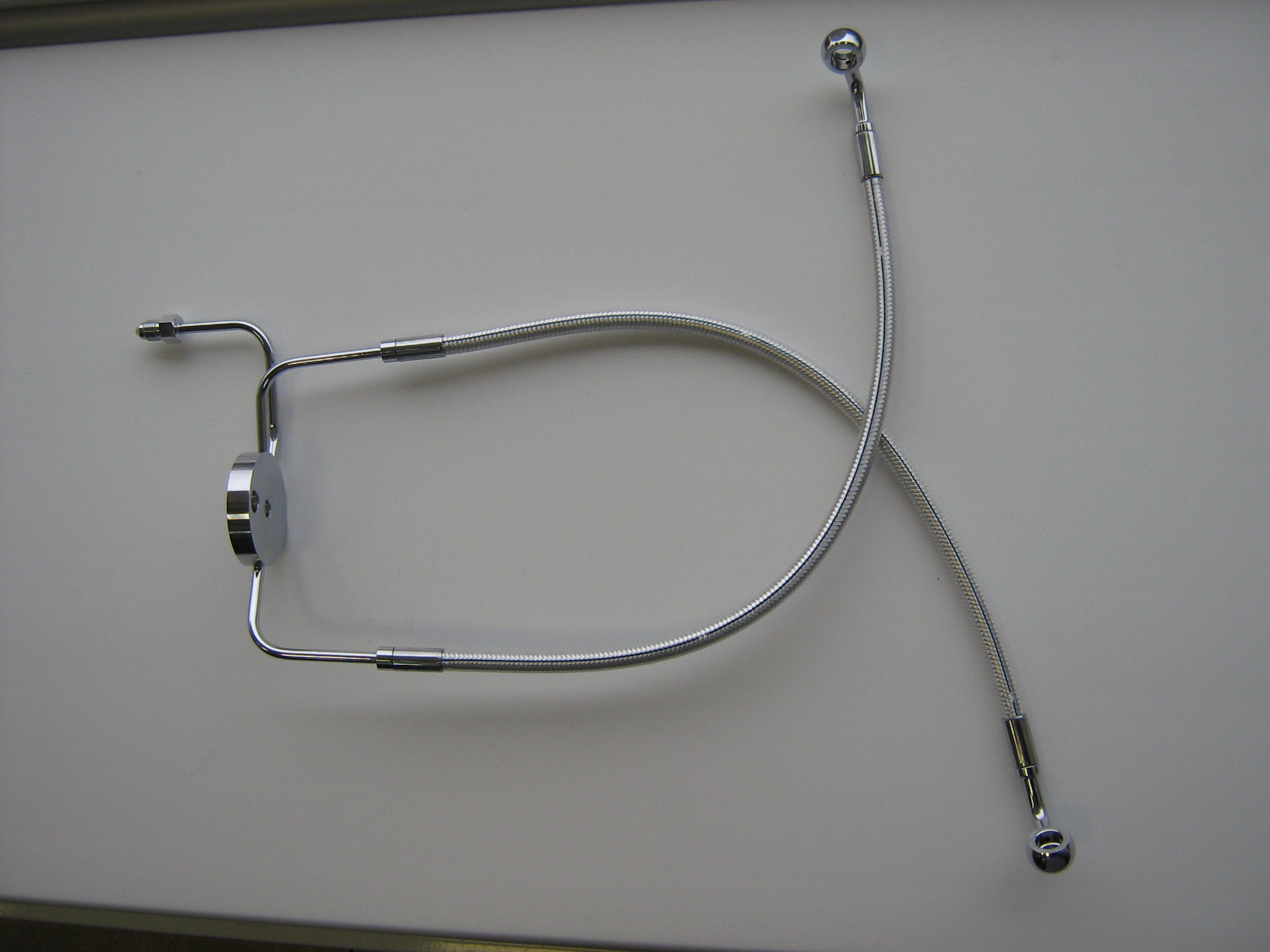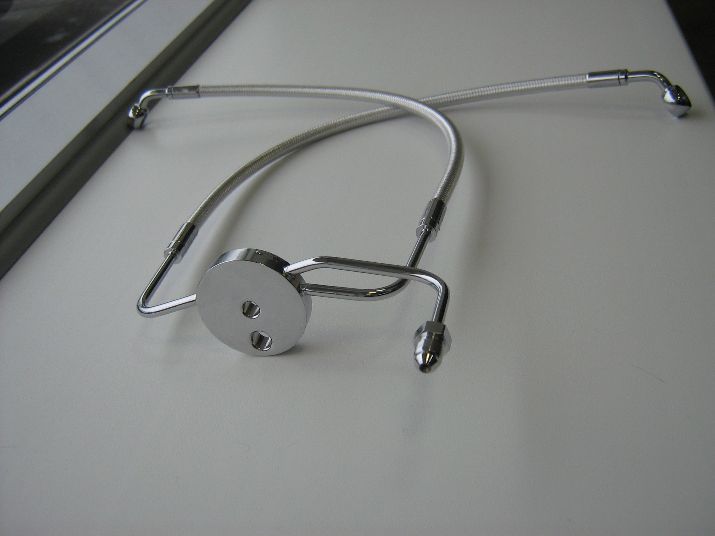 3) Шланг тормозной армир. под 2 диска, нижняя часть, с хром. разветвителем, фирма "Magnum". Завальцованные фитинги 35 град. 3/8 (10 мм.) На разветвителе резьба под верхнюю часть шланга (может быть любой длины, в зависимости от руля) Длина от разветвителя до фитинга 40см. вместе с фитингом 45см. Новый, в коробке. Шайбы под фитинги прилагаются. Вообще, сделан под 04-08 XL 883R, 1200R. Номер по FAT BOOK: 1741-0474.