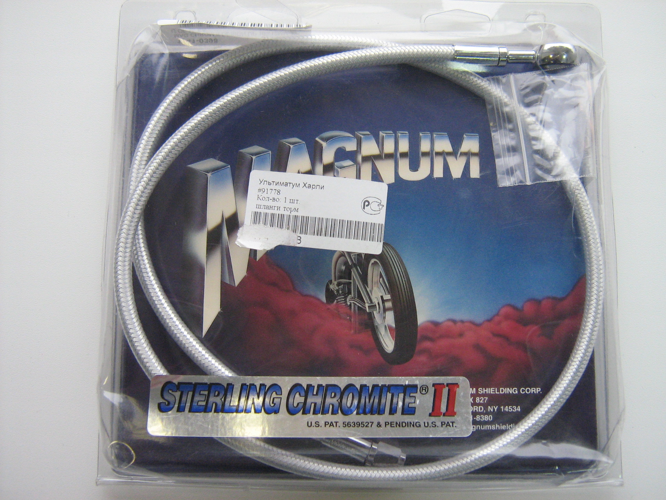 2) Шланг тормозной, фирма "Magnum", армированный. С одной стороны фитинг хром. 180 град. (прямой) 7/16 (12мм.) завальцован намертво. С другой концевик с резьбой под фитинг. Длина 1 м. Новый, в коробке. Шайбы под фитинг прилагаются. Номер по FAT BOOK: 1741-0398